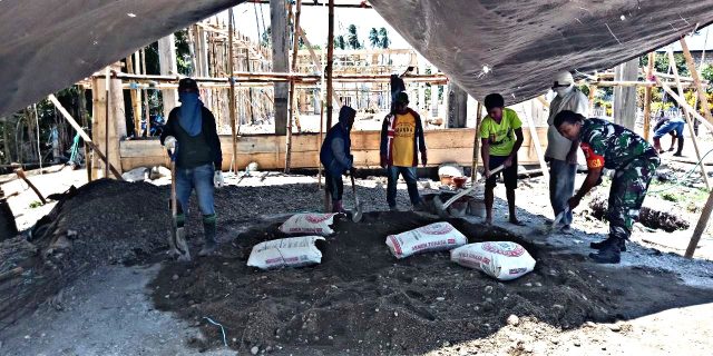 BOLTIM lensasulut.com – Babinsa Koramil 1303-05/Kotabunan, Kopda Rusdin Mamonto, membantu masyarakat dan Pemerintah Desa Bulawan I (satu) Kecamatan Kotabunan Kabupaten Boltim melakukan pengecoran bangunan gedung sanggar seni Kecamatan Kotabunan, Selasa (11/9).