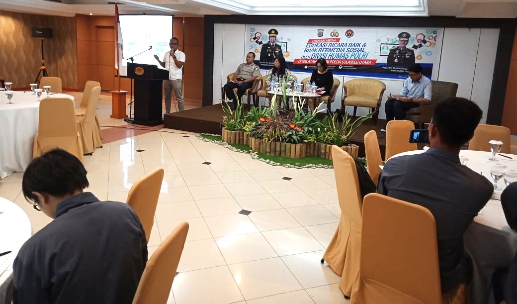 MANADO lensasulut.com – Biro Multimedia Divisi Humas Polri menggelar kegiatan edukasi bicara baik dan bijak bermedia sosial, di hotel Gran Puri Manado, Rabu (21/11/1018). Kabag Deseminasi Humas Polri Kompol Heru YL mengatakan, tujuan kegiatan tersebut untuk memberikan edukasi dan mengajak warga memerangi berita hoax. “Agar masyarakat tidak mudah terpengaruh dengan informasi yang tidak benar,” katanya.