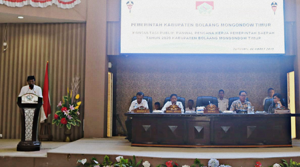 BOLTIM lensasulut.com – Pemerintah Kabupaten Bolaang Mongondow Timur (Boltim) menggelar konsultasi publik rancangan awal Rencana Kerja Pemerintah Daerah (RKPD) tahun 2020. Kegiatan dibuka secara resmi Bupati Boltim Sehan Landjar SH, di Aula Kantor Bupati, Rabu (6/3).
