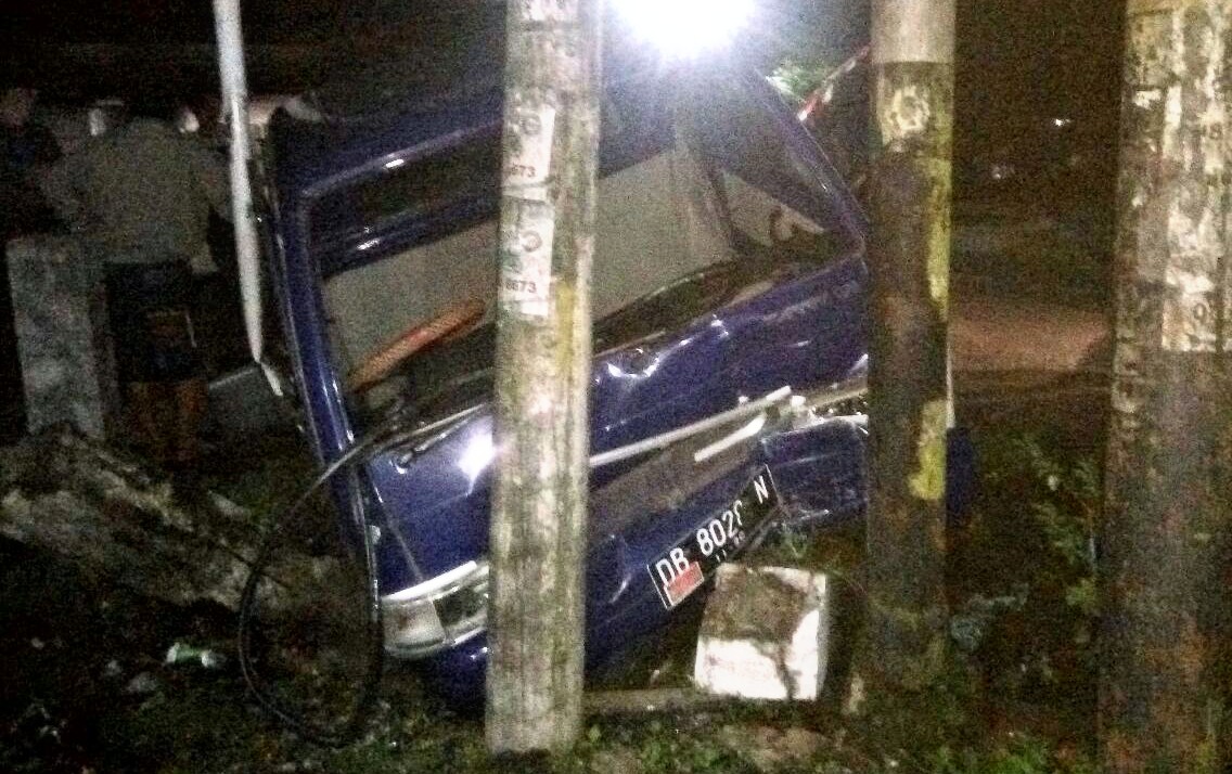 Mobil Suzuki Carry Nomor Polisi DB 8028 N yang di kendaraai oleh Oky (57) warga Desa Mooat Kecamatan Mooat, menabrak tiang papan reklame. Diduga sopir dalam keadaan mabuk.