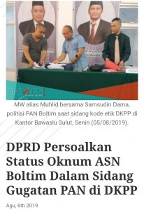Hal ini disampaikan Muchlid saat menjawab pertanyaan sejumlah wartawan perihal berita keberadaan dia selaku ASN saat sidang DKPP di Bawaslu Sulut. Seperti yang diberitakan oleh media online Ambang Dotco, dengan judul “DPRD Persoalkan Status Oknum ASN Boltim Dalam Sidang Gugatan PAN di DKPP”, tertanggal 6 Agustus 2019.