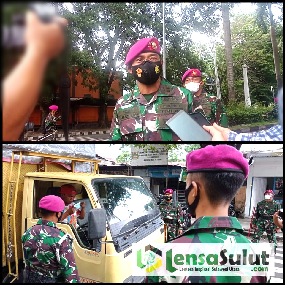 BITUNG LensaSulut.com – Guna untuk menekan penyebaran Covid-19 di kota Bitung yang semakin meningkat, personil Batalyon Marinir Pertahanan Pangkalan (Yonmarhanlan) VIII Bitung, menggelar razia masker. Kegiatan ini dipimpinan langsung oleh Danyon Letkol Mar. Anugerah Auliadi Santos M.Tr. Hanla M.M, di depan Mako Yonmarhanlan. Kamis (4/2/21).