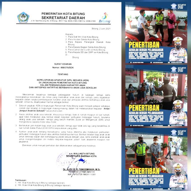 Pada sosialisasi Surat Edaran Wali Kota Bitung tentang Kepeloporan Aparatur Sipil Negara (ASN) di Lingkungan Pemerintah Kota Bitung Dalam Pembangunan Karakter Anak dan Antisipasi Aktifitas Berbahaya Anak Usia Sekolah kata Kanit Dikyasa Satuan Lalu Lintas dalam meteri sosialisasi menekankan beberapa hal diantaranya :