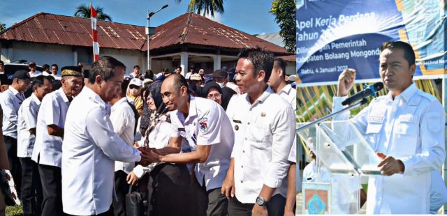 “Dalam rangka apel perdana Pemerintah Kabupaten Bolaang Mongondow Timur, seluruh rekan-rekan ASN mulai dari sekda asisten dan kepala dinas, kepala badan, kepala bagian, seluruh peserta apel yang hadir pertama-tama saya mengucapkan selamat Natal, selamat Tahun Baru kepada yang merayakan. Ada momen bahagia di tahun baru 2023 yang beberapa hari ini telah kita pijak. Ada sebuah harapan yang kita tuju di masa depan,” ucap bupati.