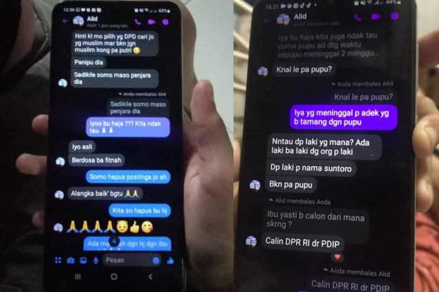 MANADO, LensaSulut.com – Marak beredar foto screenshot yang menyebut seorang wanita sebagai penipu. Pada foto hasil screenshot percakapan di aplikasi messenger dari pemilik akun bernama Alid menyebutkan kepada seseorang bahwa wanita sebagai penipu tersebut adalah bakal calon anggota DPD.