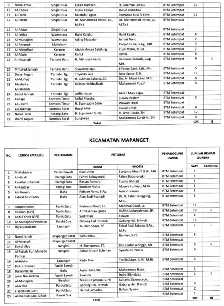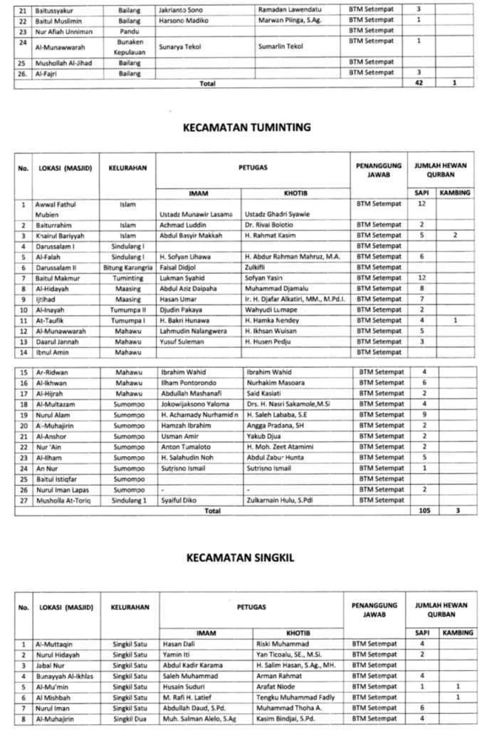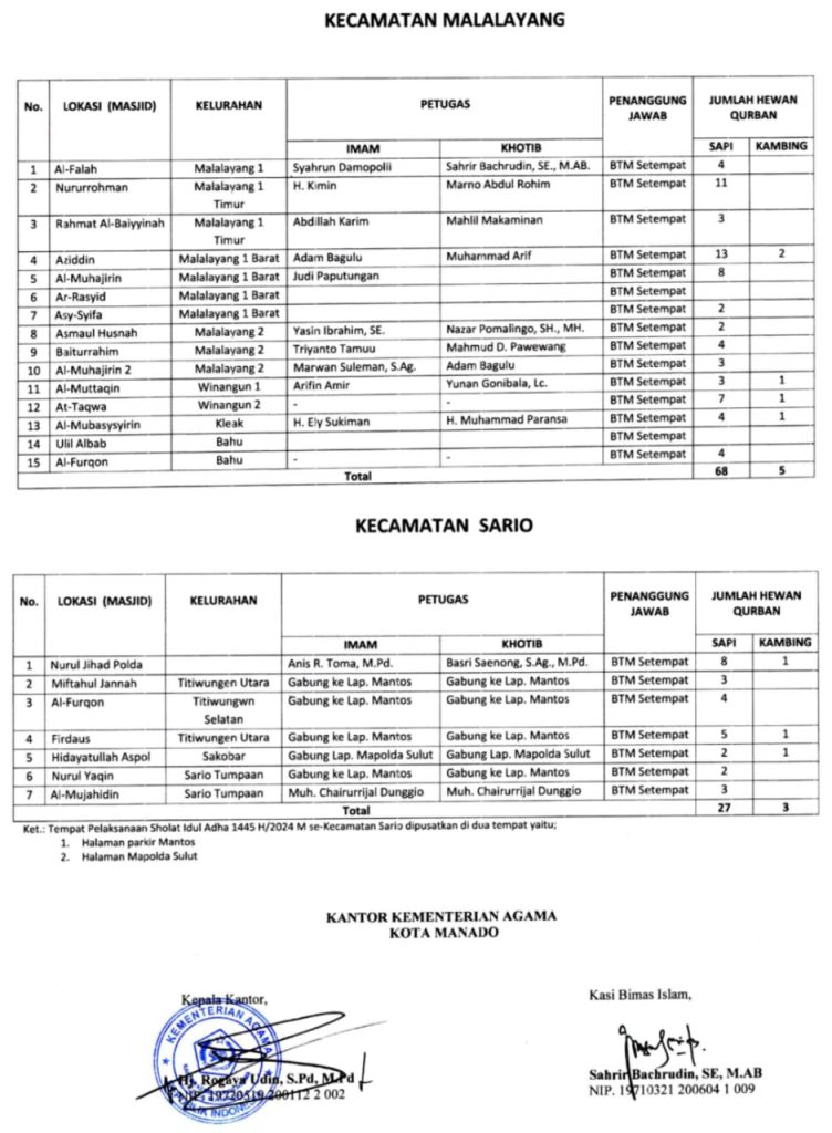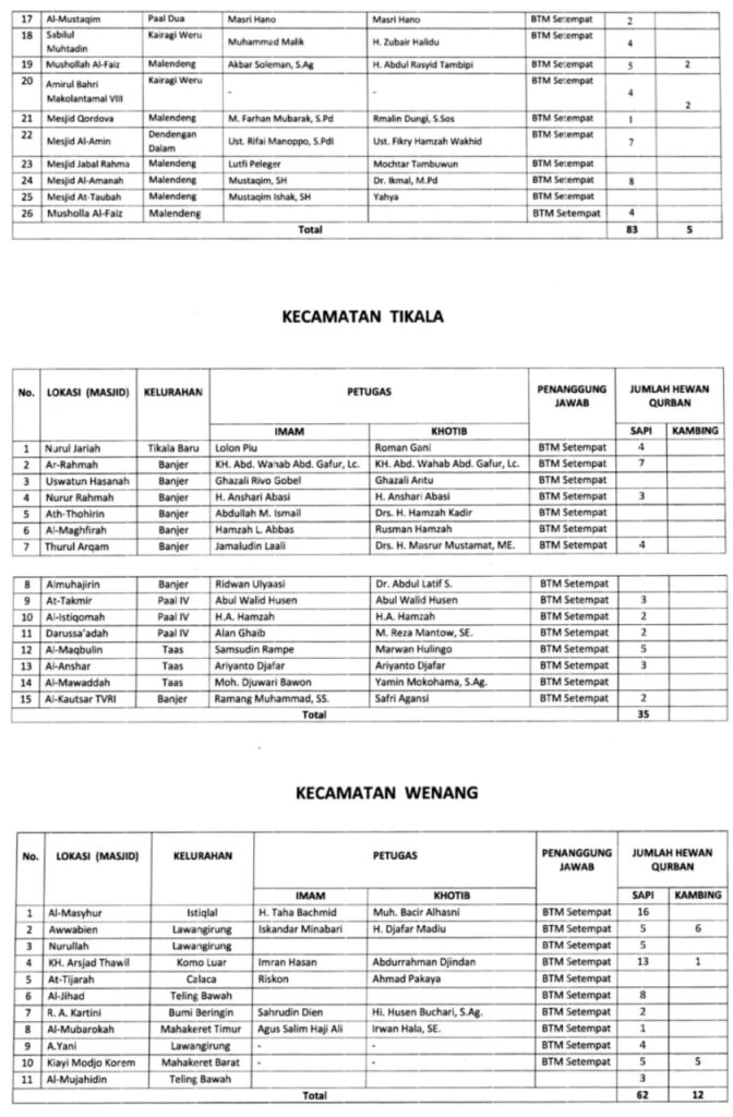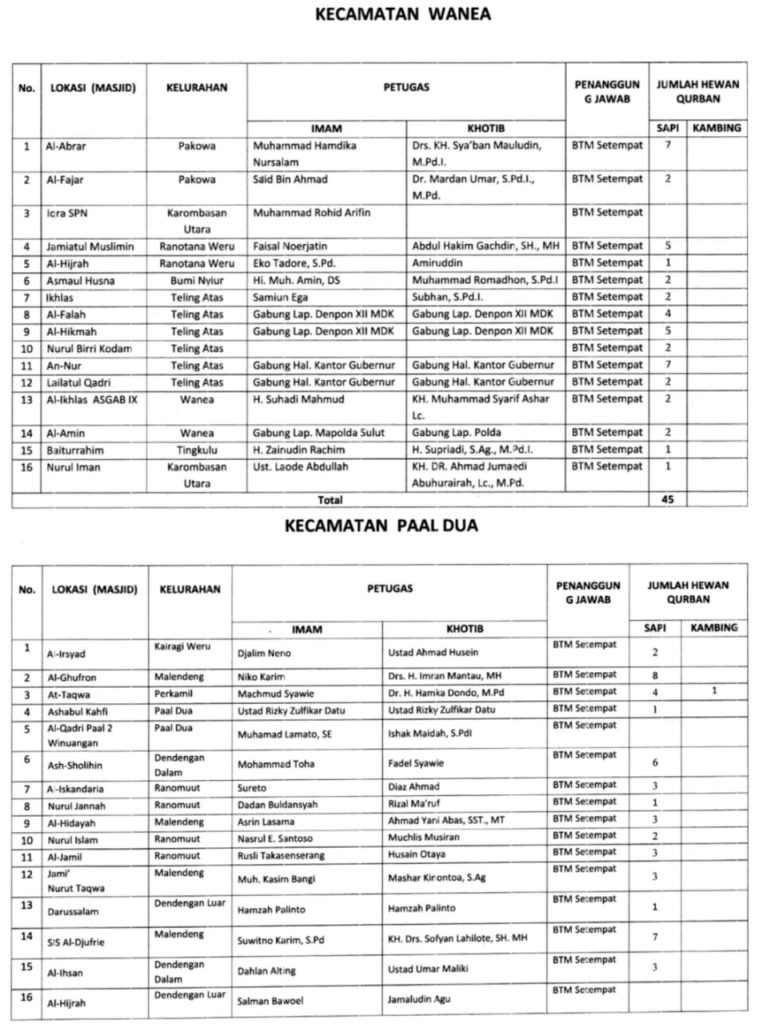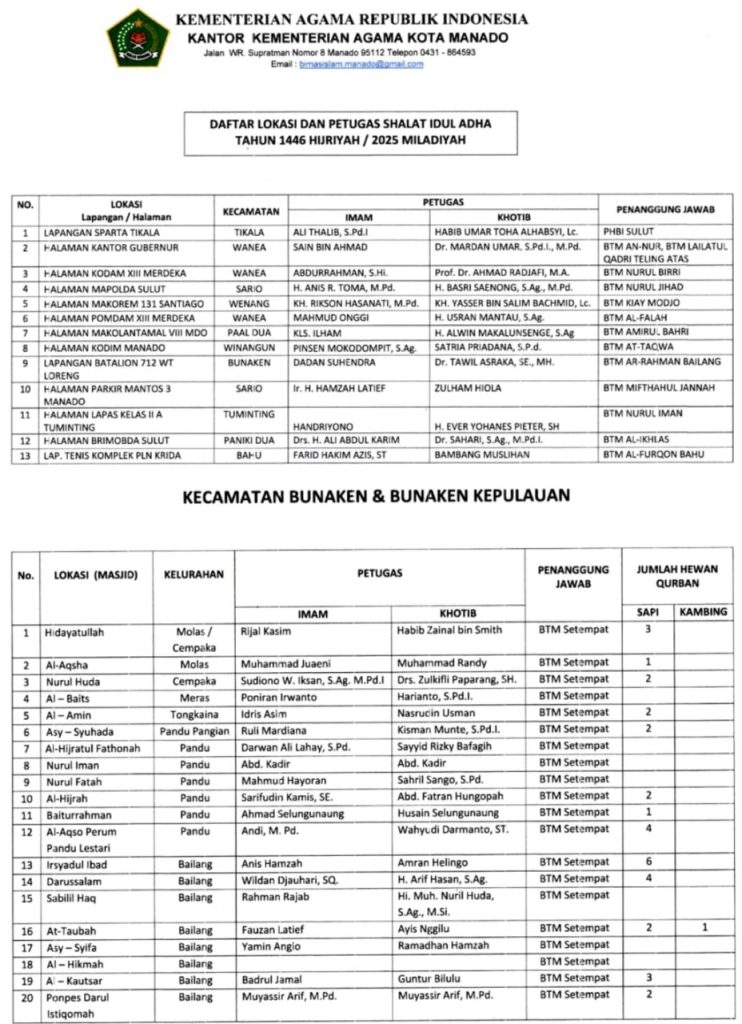 Berikut jadwal lengkap Imam dan Khotib Shalat Idul Adha tahun 2025 di 171 lokasi kota Manado