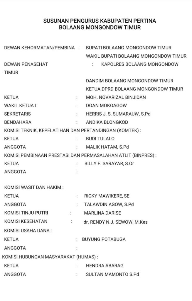 Selain Novarizal sebagai ketua, struktur kepengurusan Pertina Boltim juga diisi oleh figur-figur muda dan pemerhati olahraga: