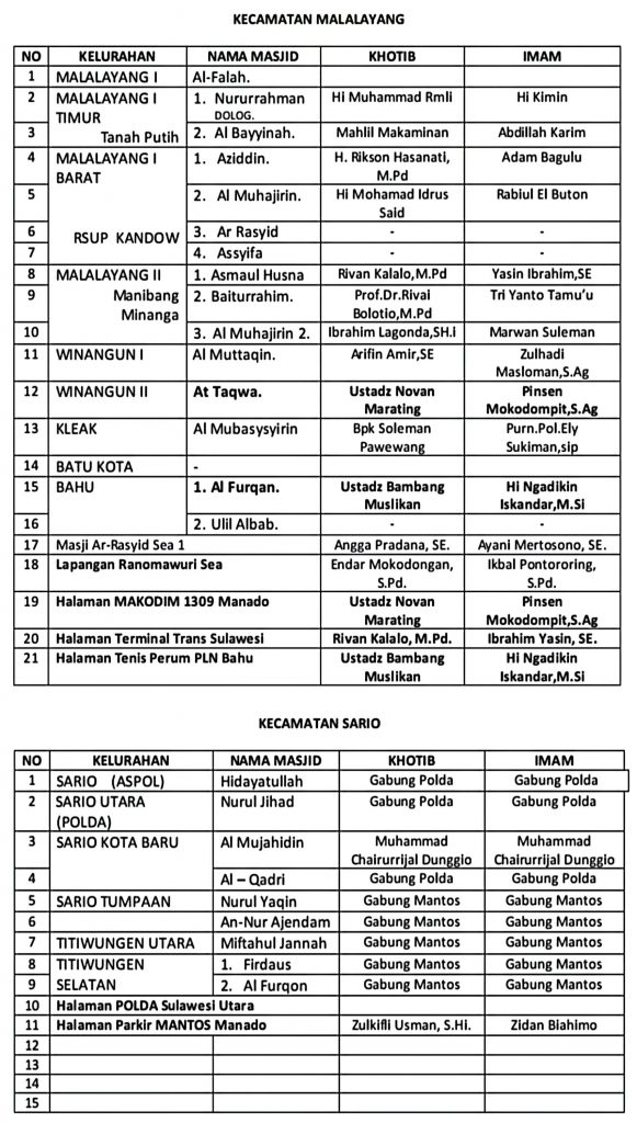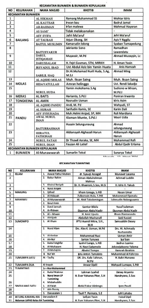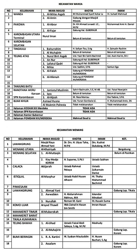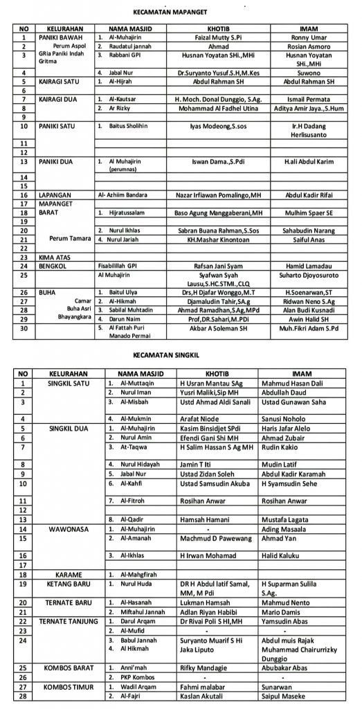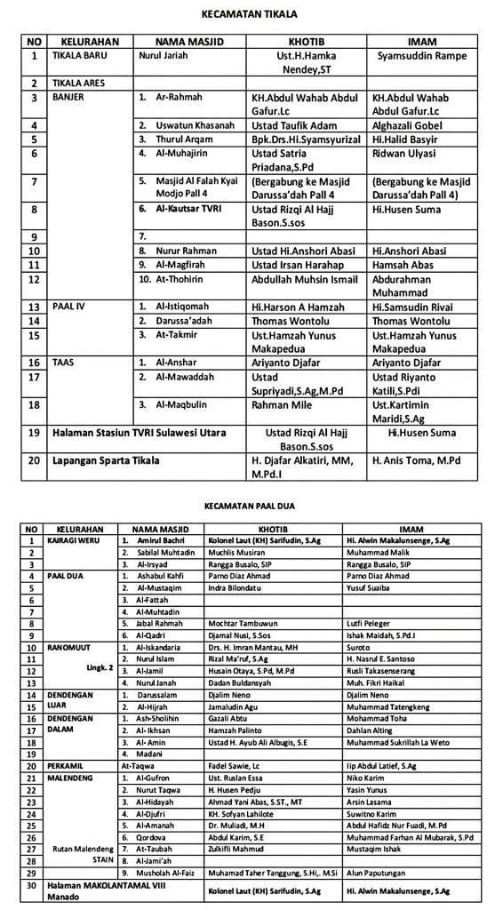 Sementara itu, Kepala Seksi Bimas Islam Kemenag Manado, Hi. Sahrir Bachrudin, mengatakan bahwa penyusunan jadwal ini merupakan hasil koordinasi bersama seluruh Kepala KUA dengan Panitia Hari Besar Islam (PHBI) kecamatan, serta imam dan ketua Badan Ta’mir Masjid (BTM) se-Kota Manado.